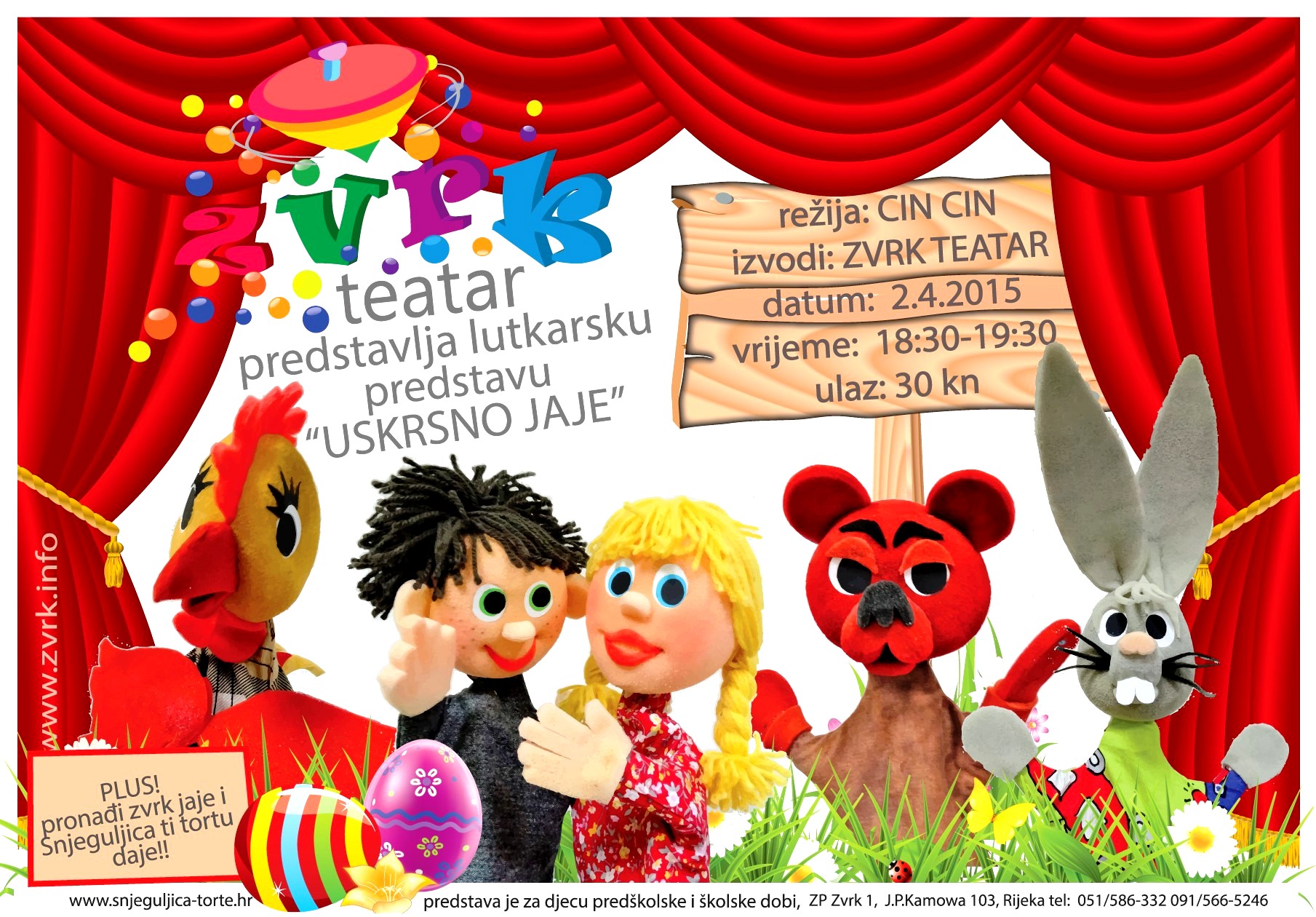 Povodom nadolazećih uskrsnih blagdana u ZP Zvrk 2. travnja u 18:30 održati će se lutkarska predstava “Uskrsno jaje” za djecu predškolske i školske dobi. Režiju potpisuje CIN CIN, a izvodi je Zvrk Teatar!